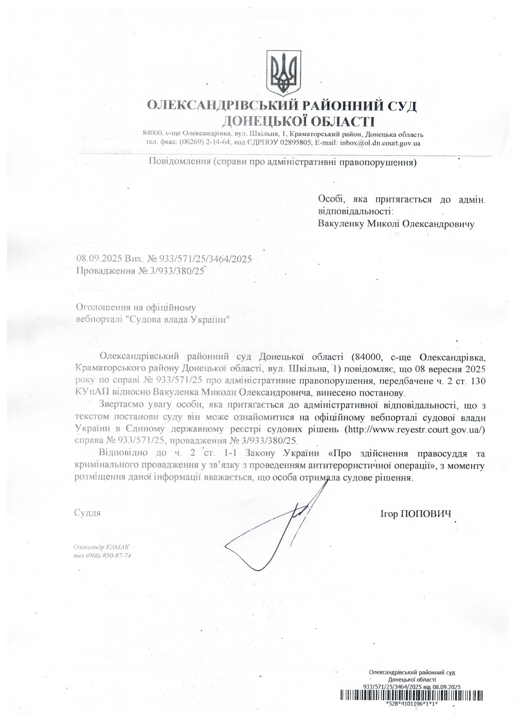 Оголошення для Вакуленка М.О.