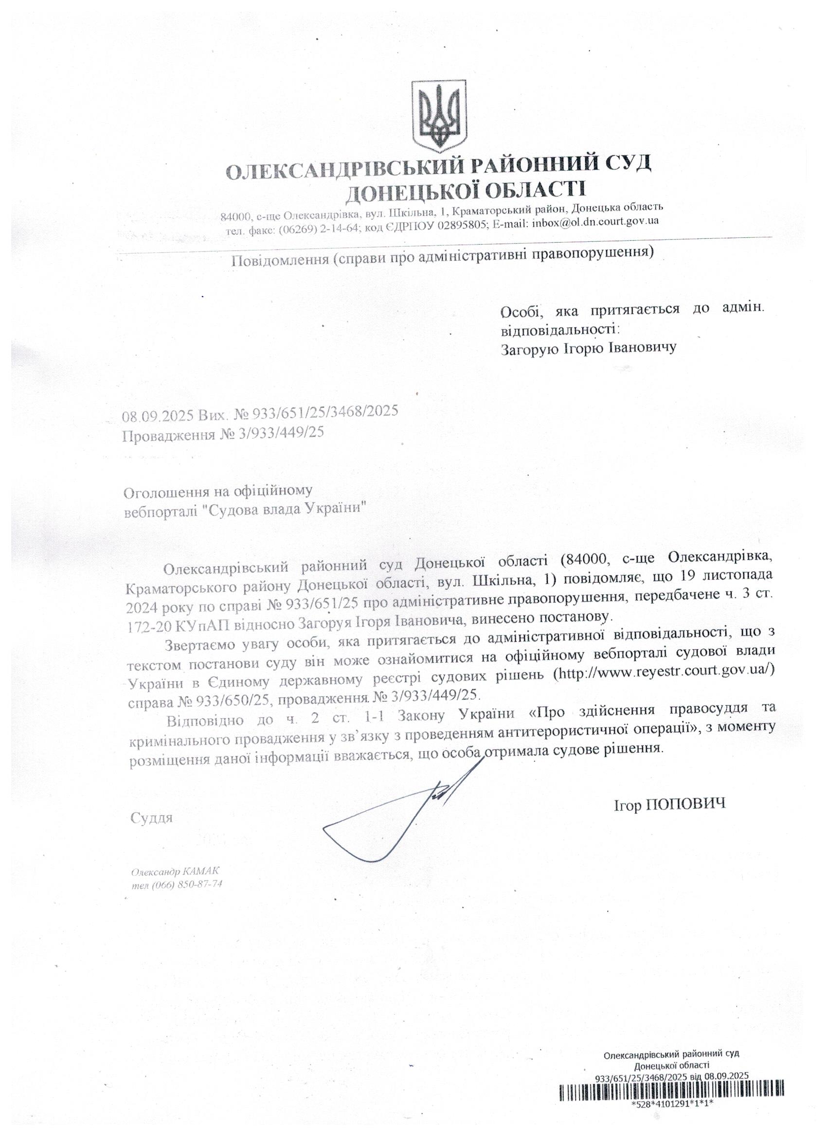 Оголошення для Загоруя І.І.