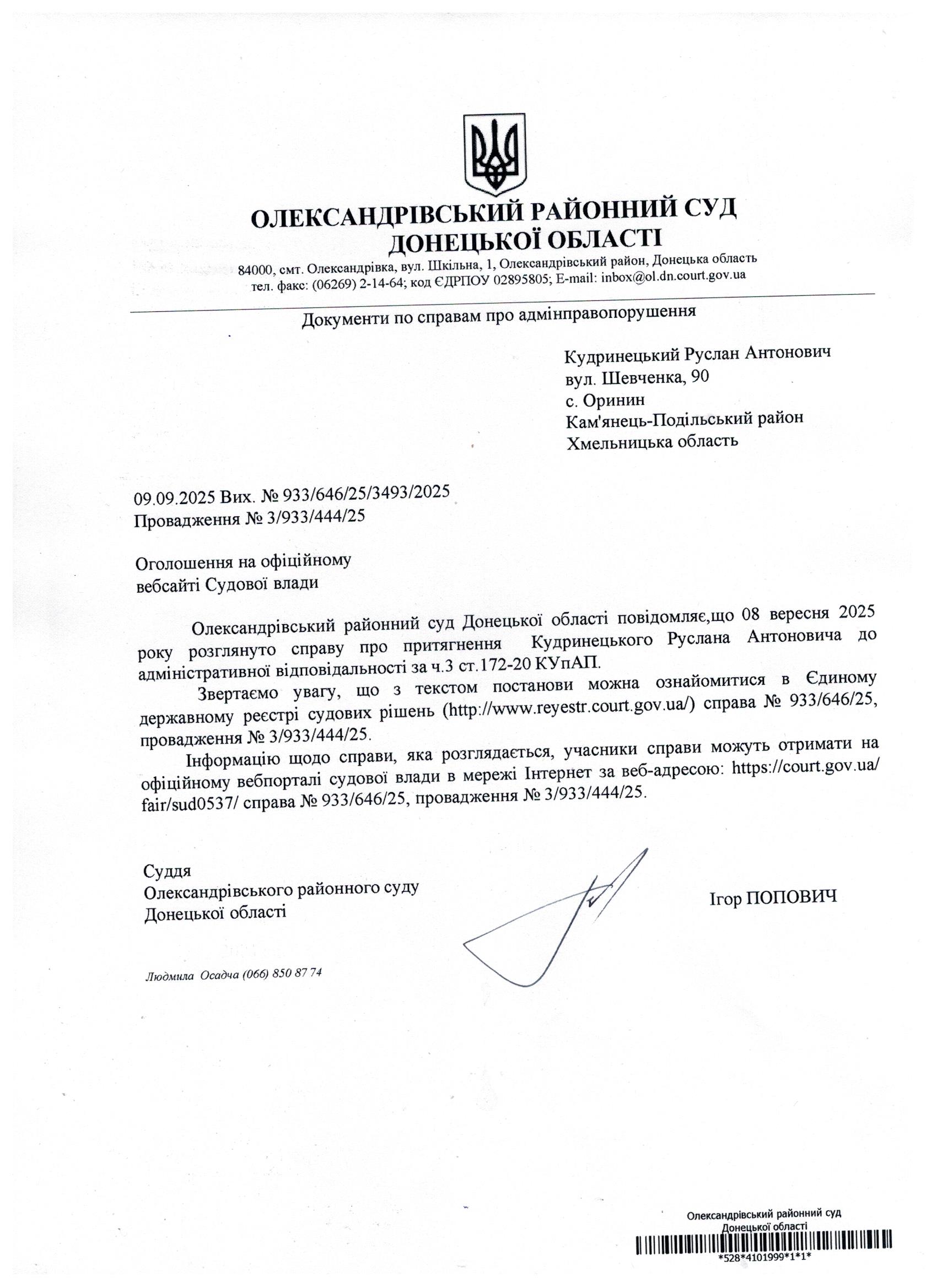 Оголошення для Кудринецького Р.А.