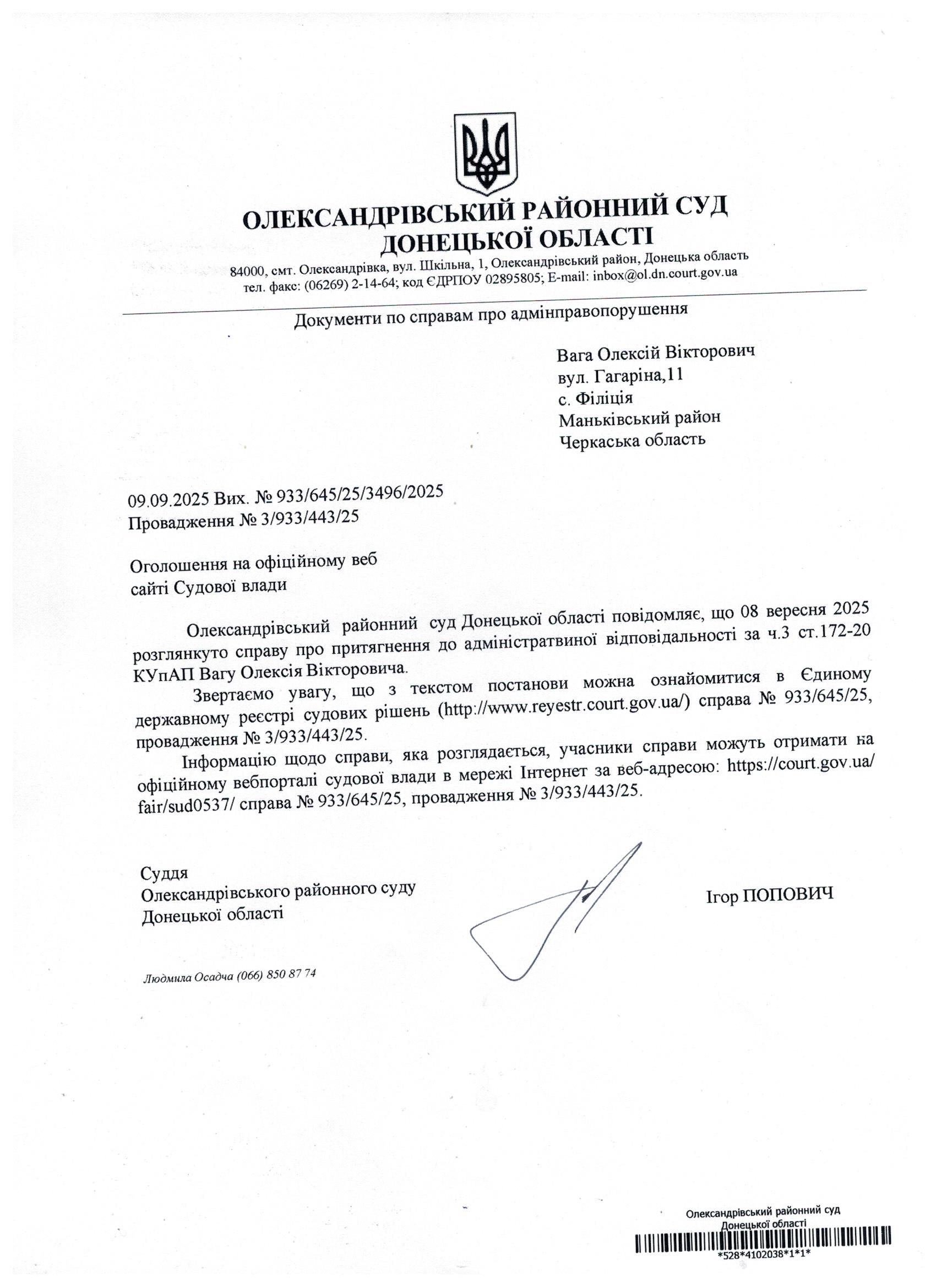 Оголошення для Ваги О.В.