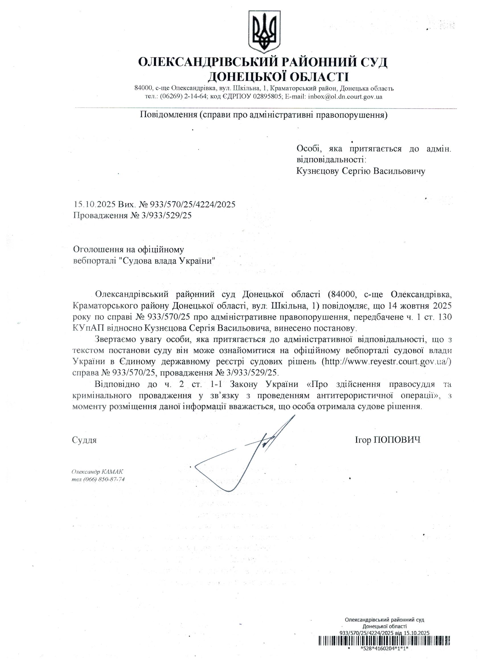 Оголошення для Кузнєцова С.В.