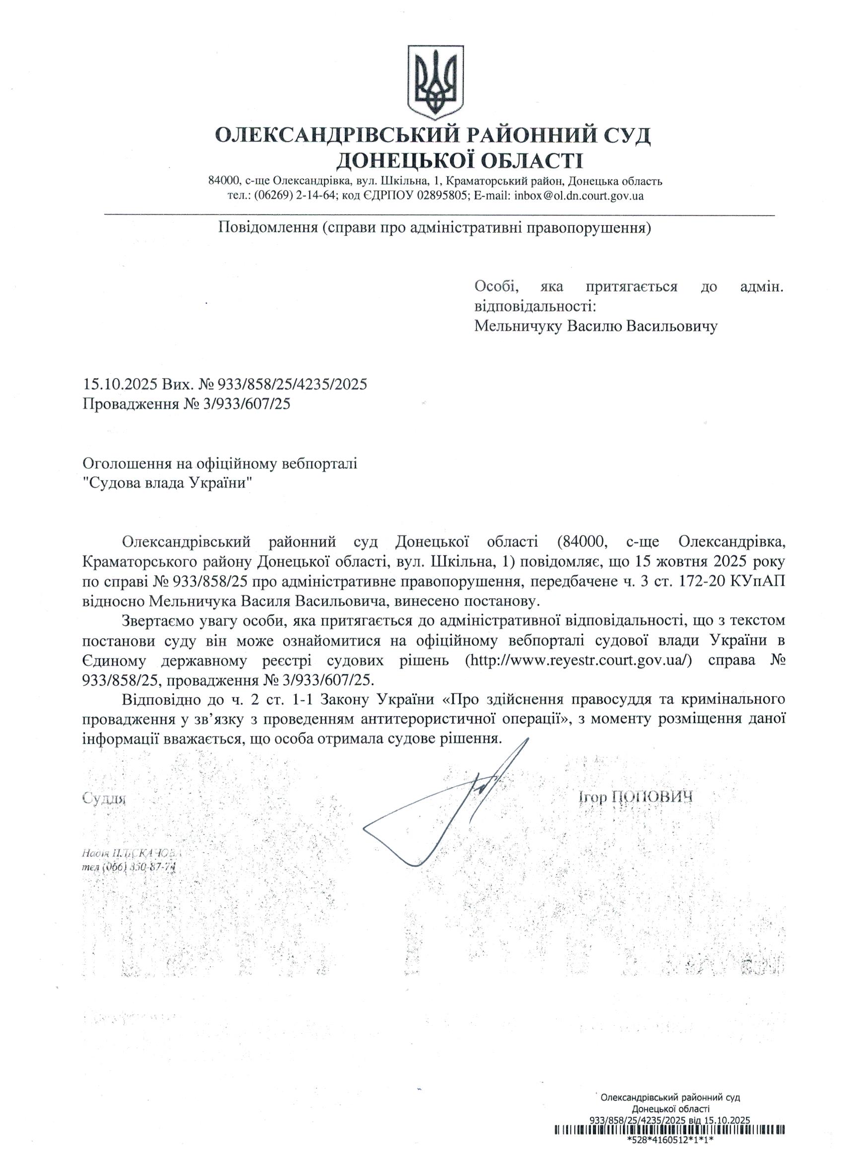 Оголошення для Мельничука В.В.