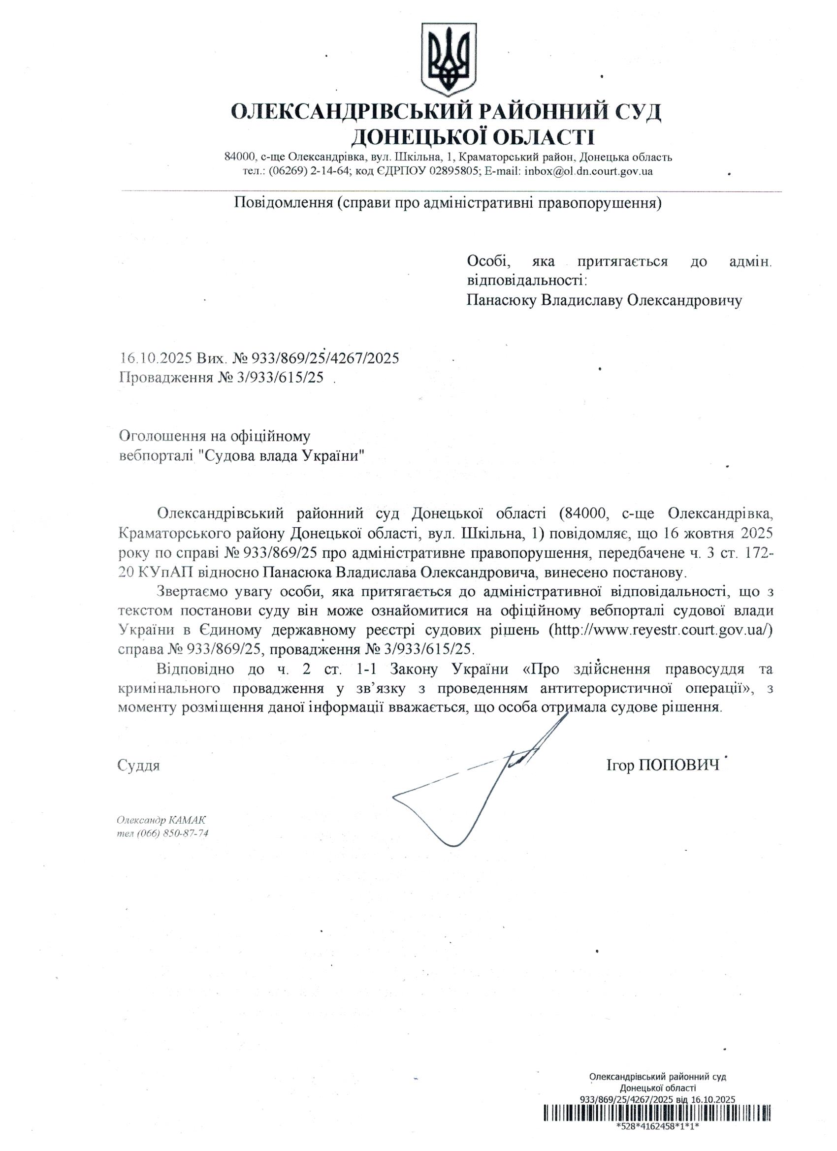Оголошення для Панасюка В.О.