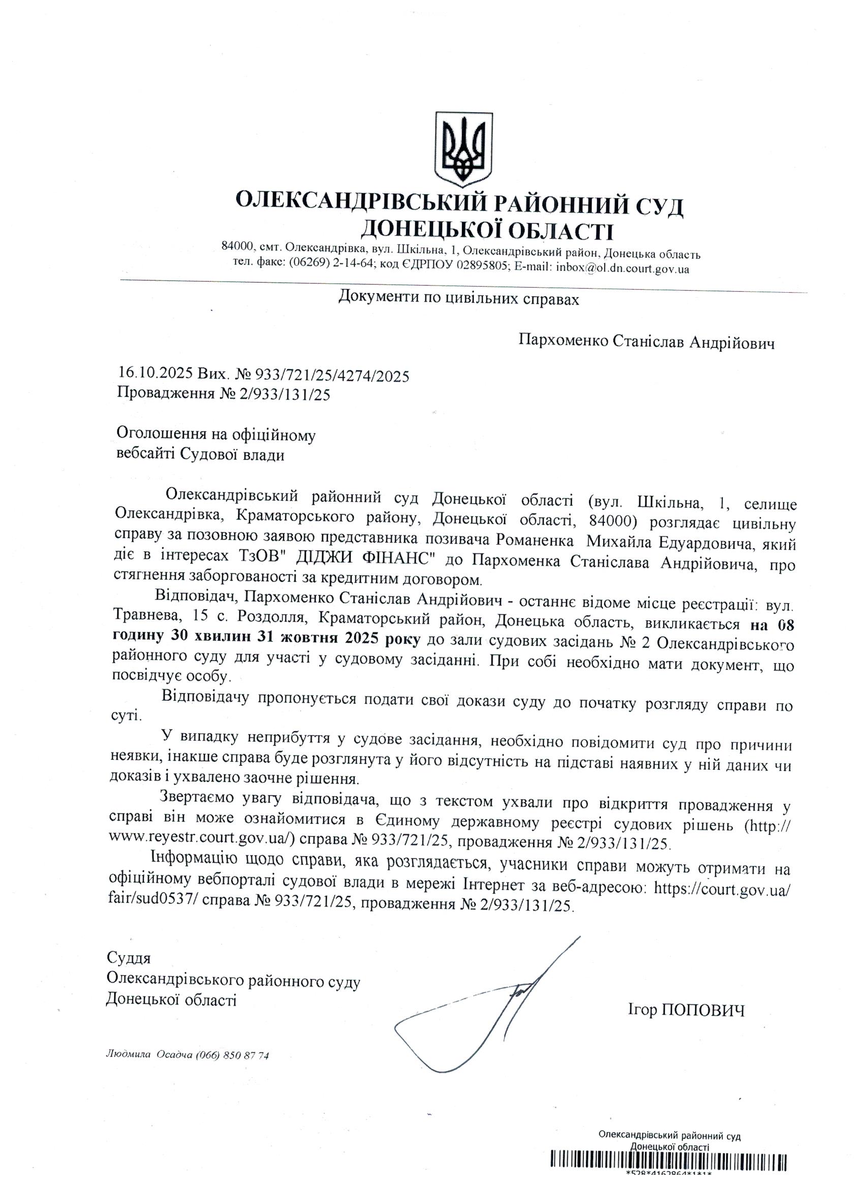 Оголошення для Пархоменка С.А.