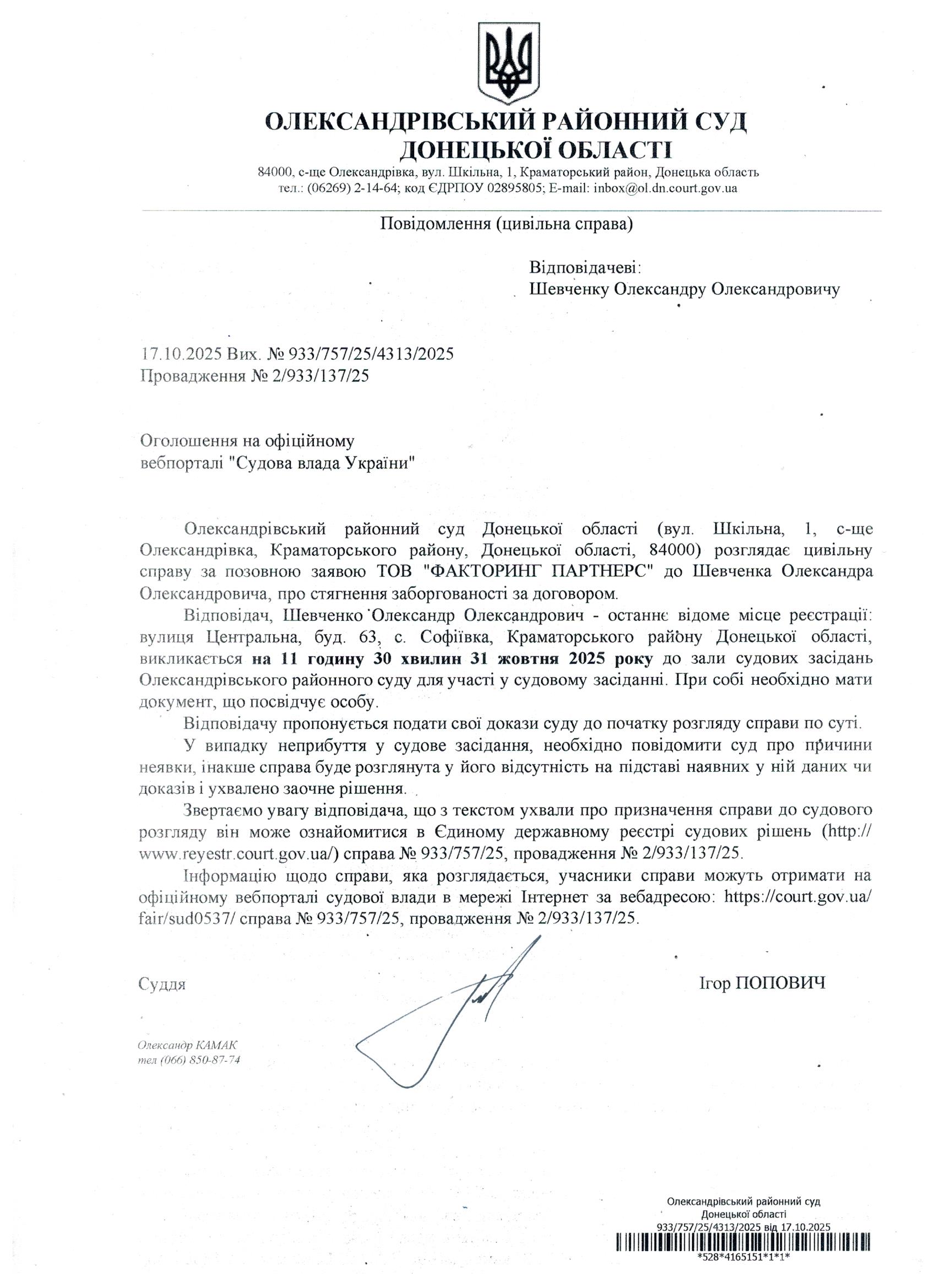 Оголошення для Шевченка О.О.
