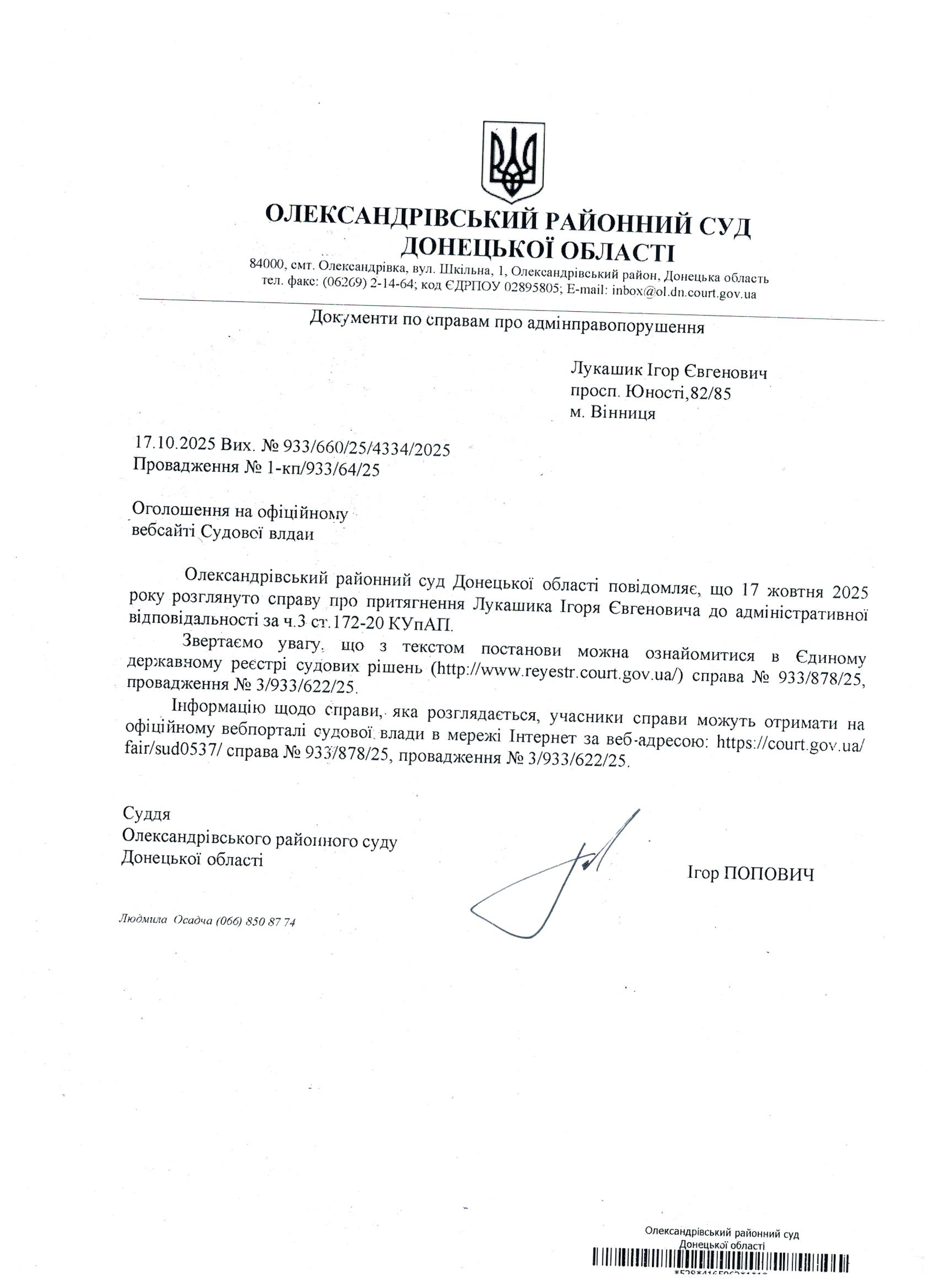 Оголошення для Лукашика І.Є.