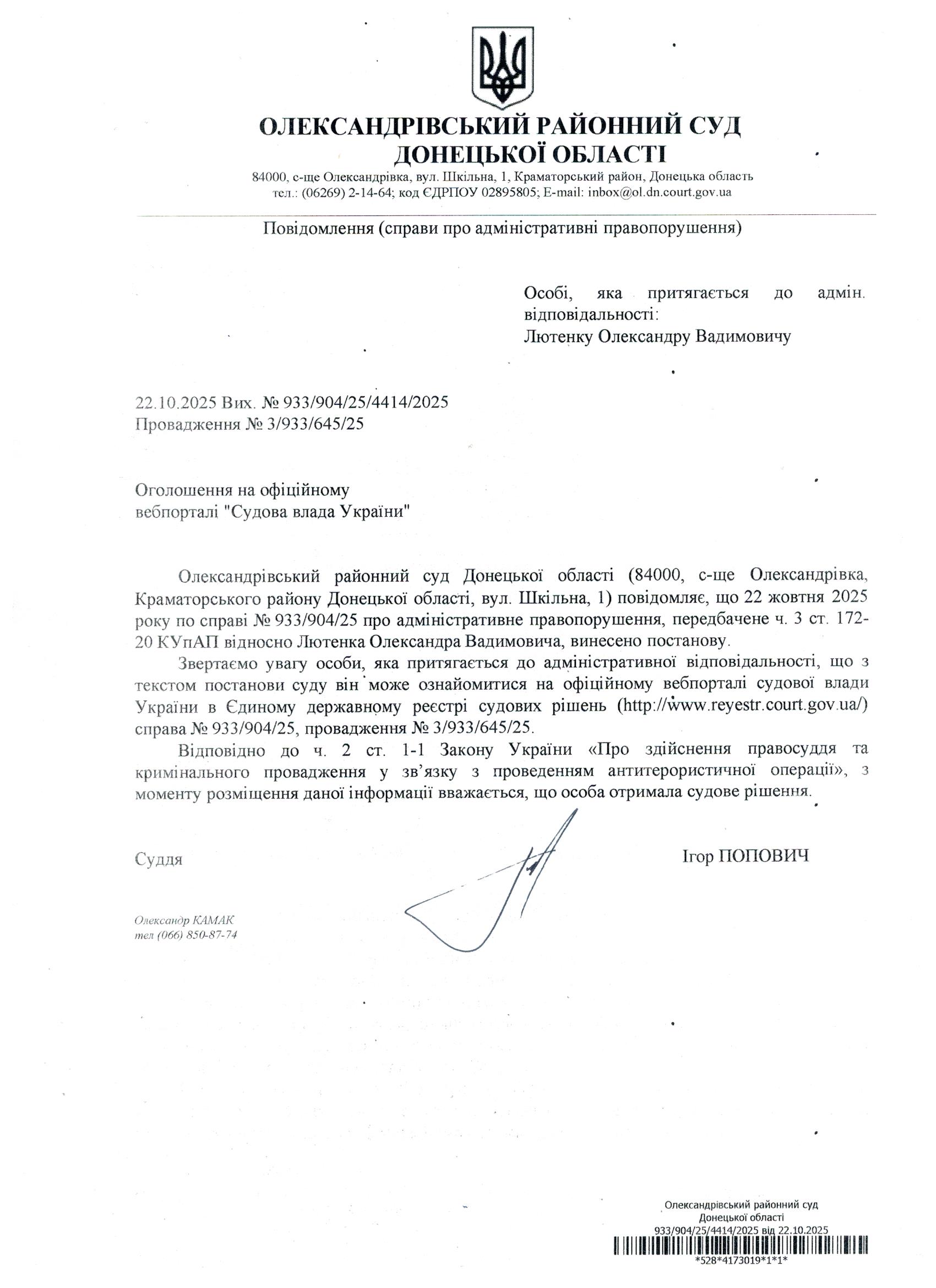 Оголошення для Лютенка О.В.