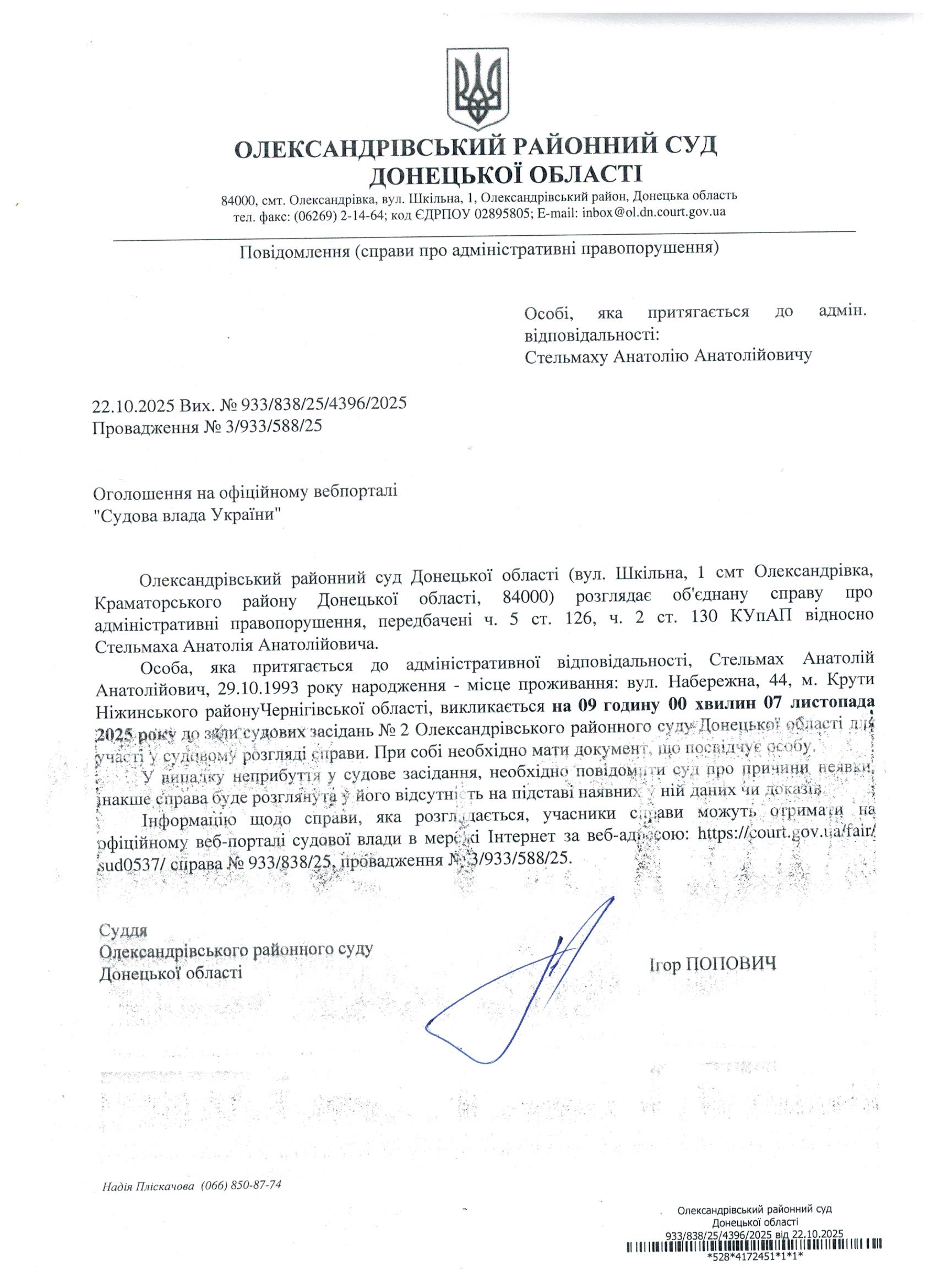 Оголошення для Стельмаха А.А.