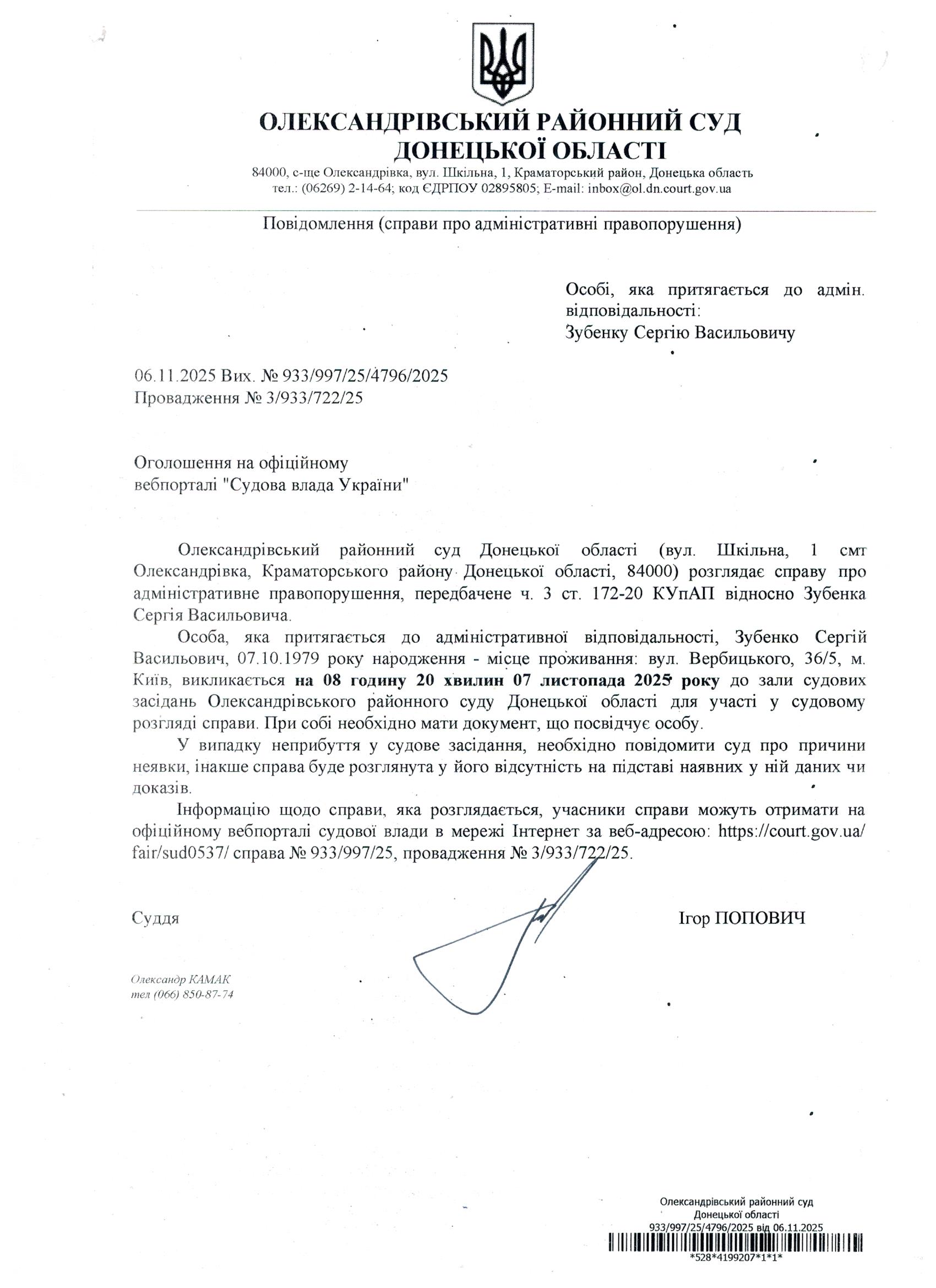 Оголошення для Зубенка С.В.