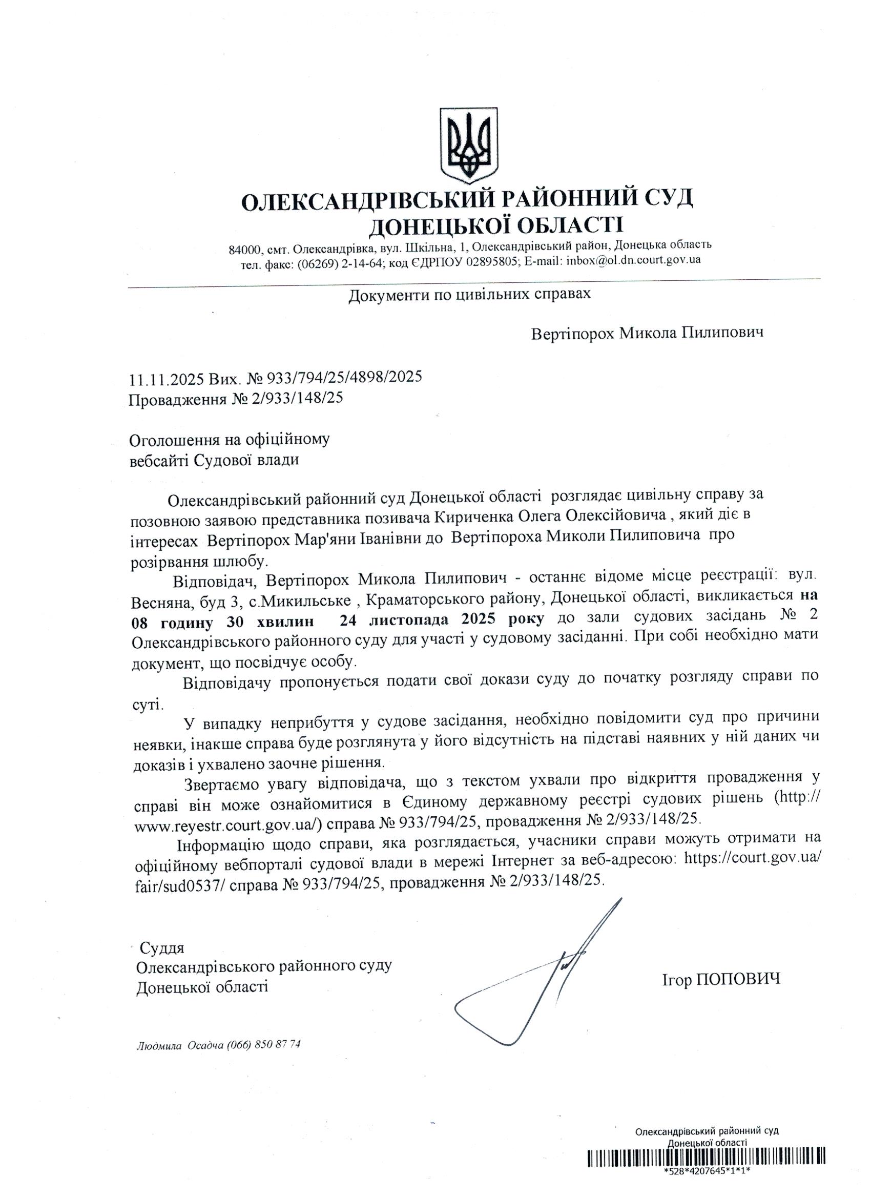 Оголошення для Вертіпороха М.П.
