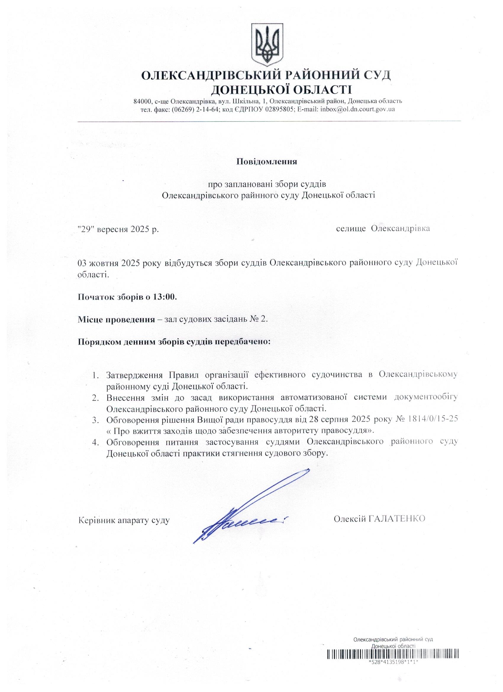ПОВІДОМЛЕННЯ ПРО ЗАПЛАНОВАНІ ЗБОРИ СУДДІВ ОЛЕКСАНДРІВСЬКОГО РАЙОННОГО СУДУ ДОНЕЦЬКОЇ ОБЛАСТІ