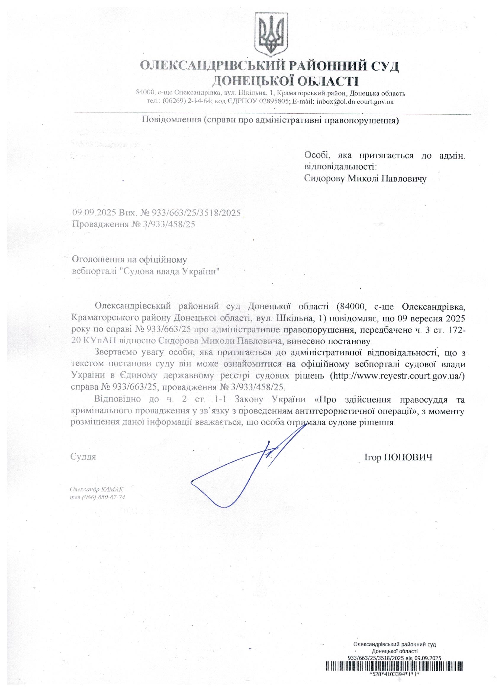 Оголошення для Сидорова М.П.