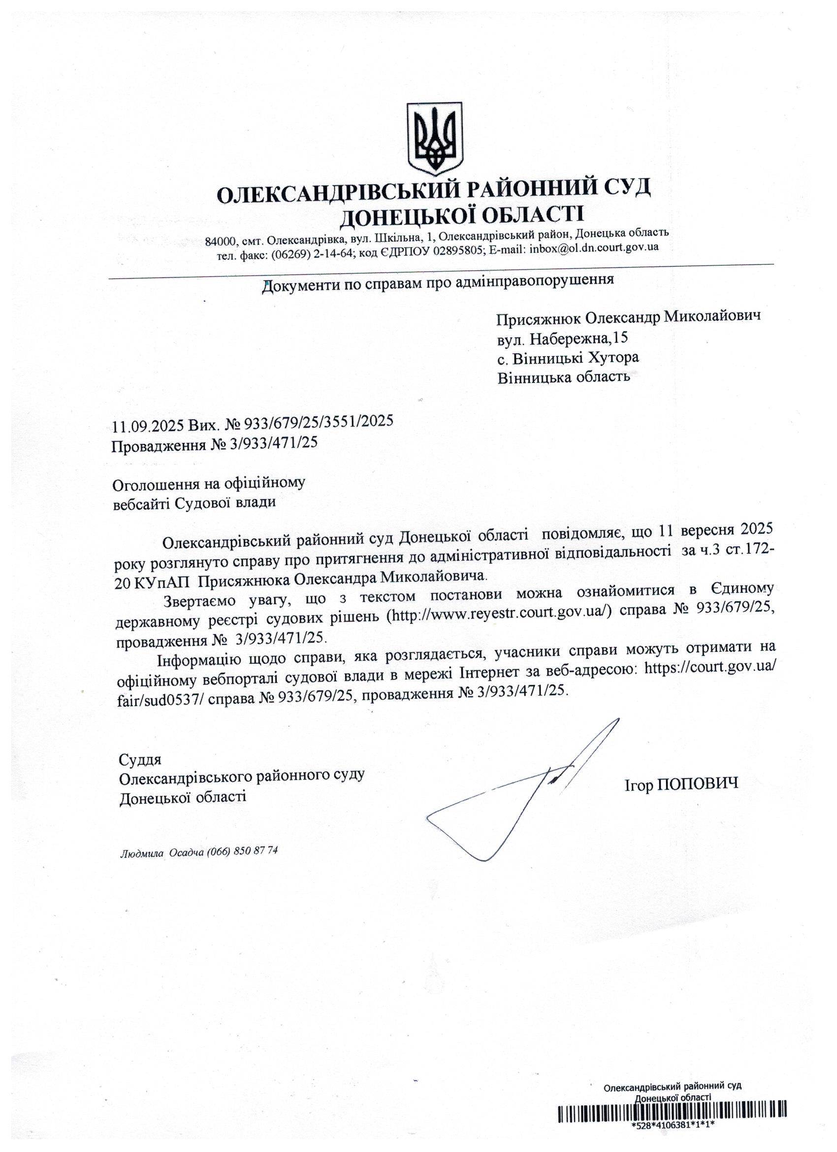 Оголошення для Присяжнюка О.М.