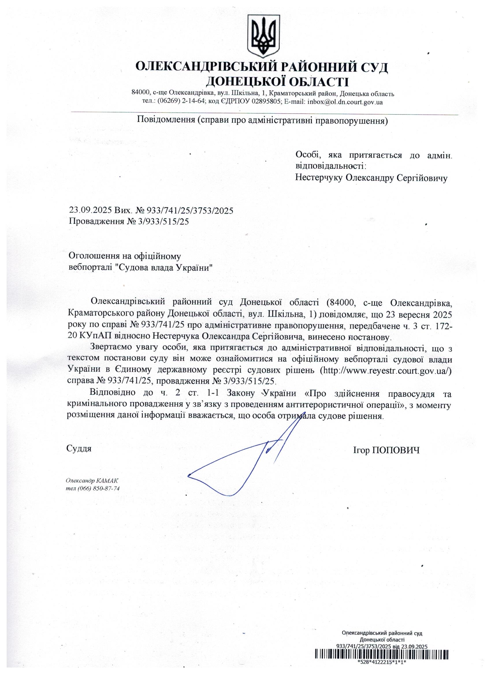Оголошення для Нестерчука О.С.