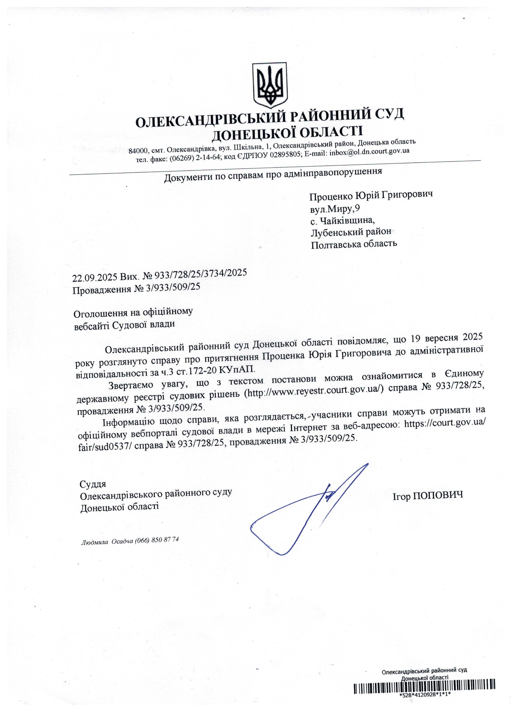 Оголошення для Проценка Ю.Г.