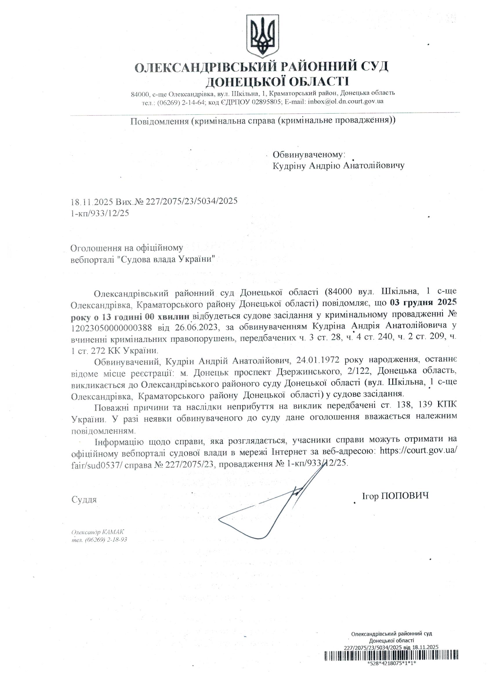 Оголошення для Кудріна А.А.
