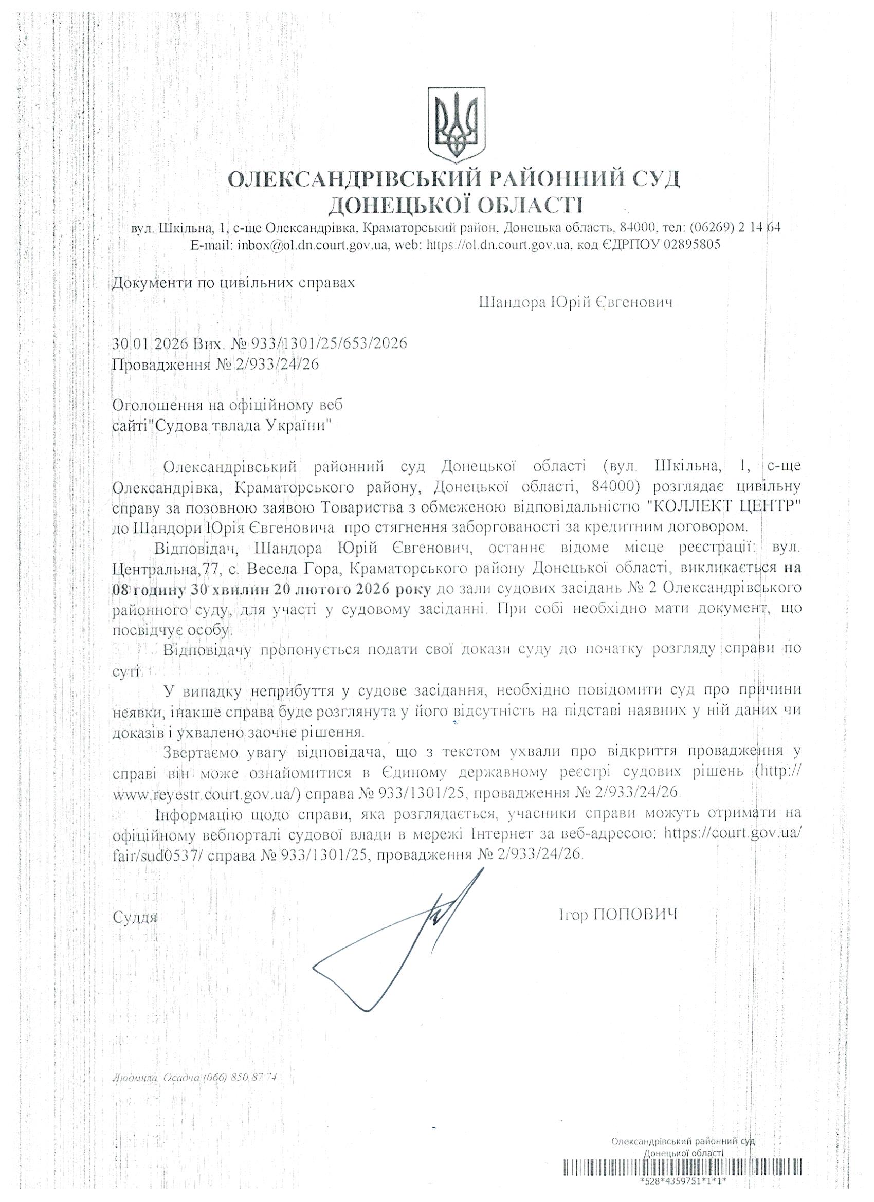 Оголошення для Шандори Ю.Є.