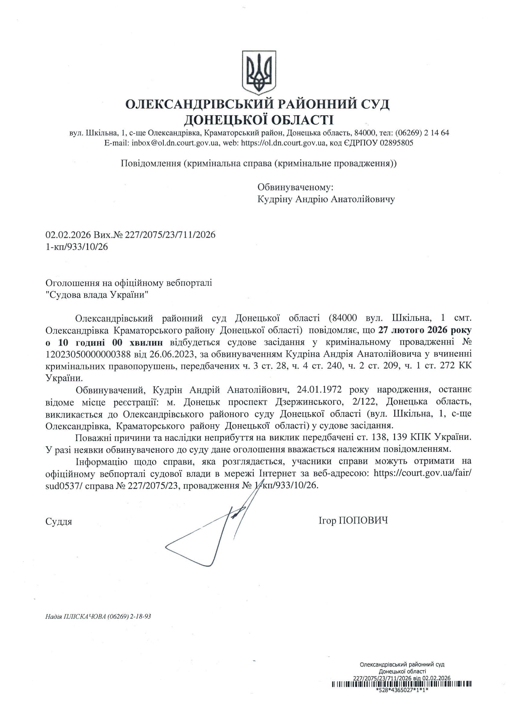 Оголошення для Кудріна А.А.