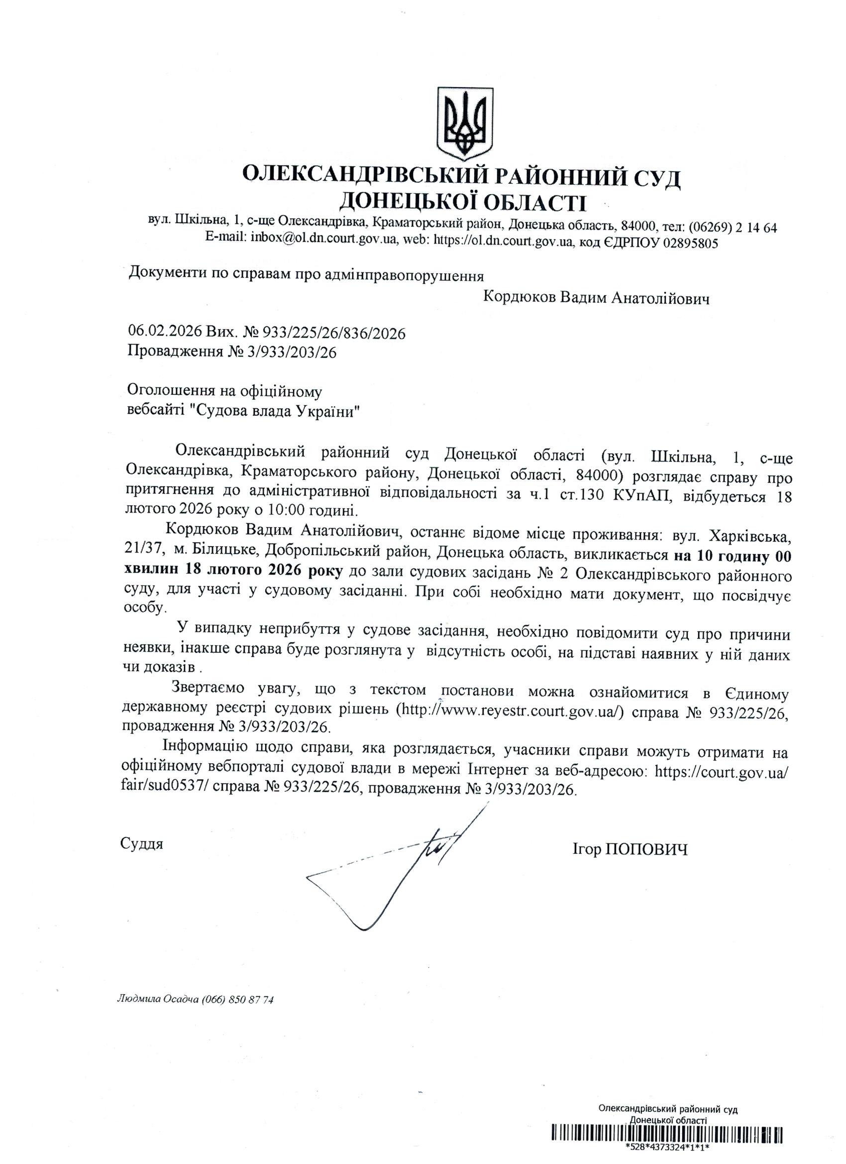 Оголошення для Кордюкова В.А.