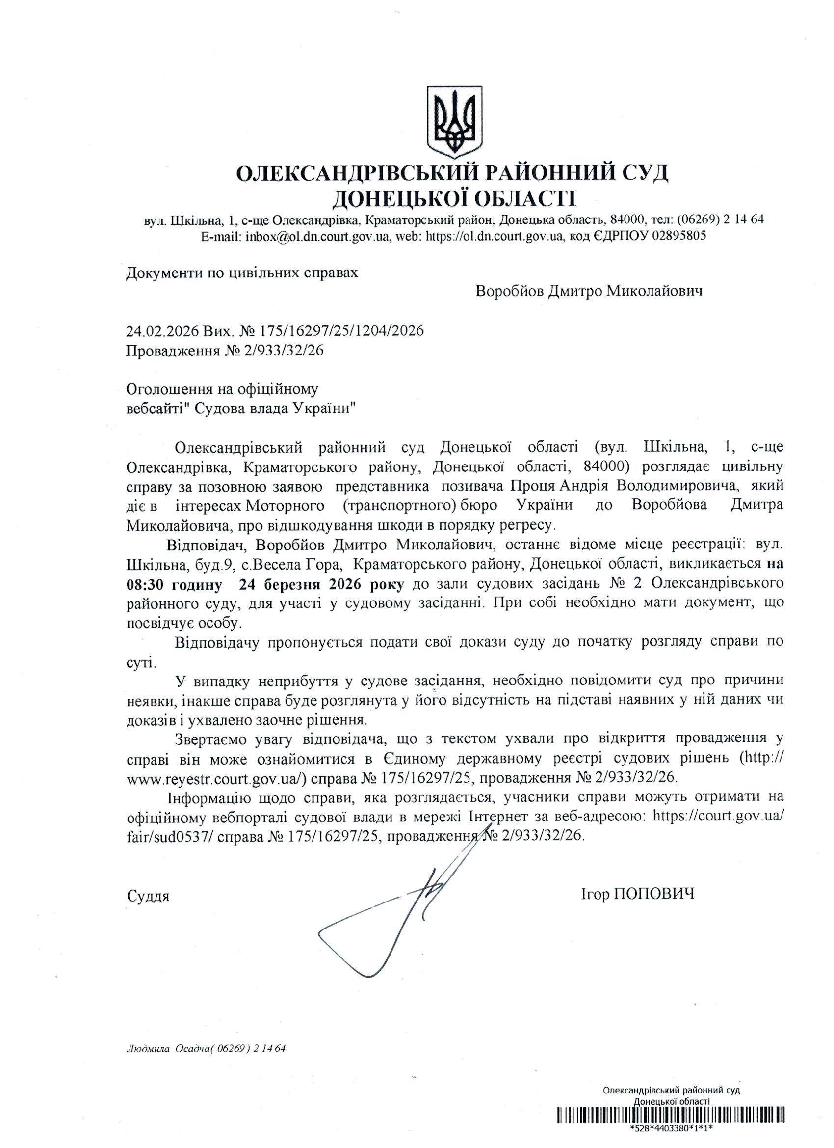 Оголошення для Воробйова Д.М.