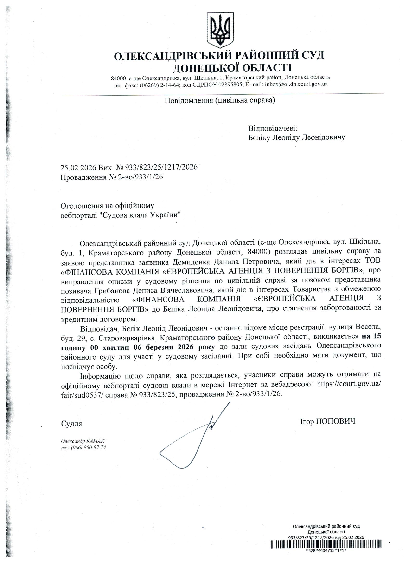 Оголошення для Бєліка Л.Л.